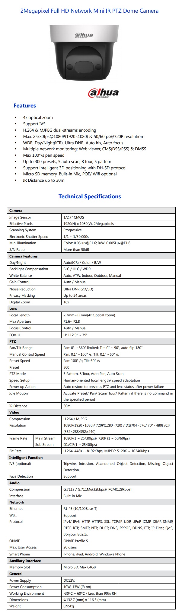 - Model: Speed Dome IP Wireless 2Mpx IR 30m DNR DayNight Dahua