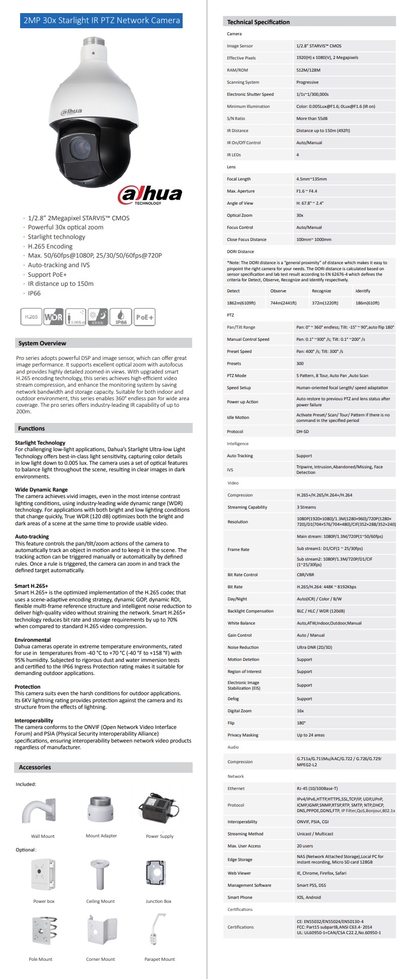 - Model: Speed Dome IP Starlight 1080p 30x IR 150m 3DNR PoE Dahua