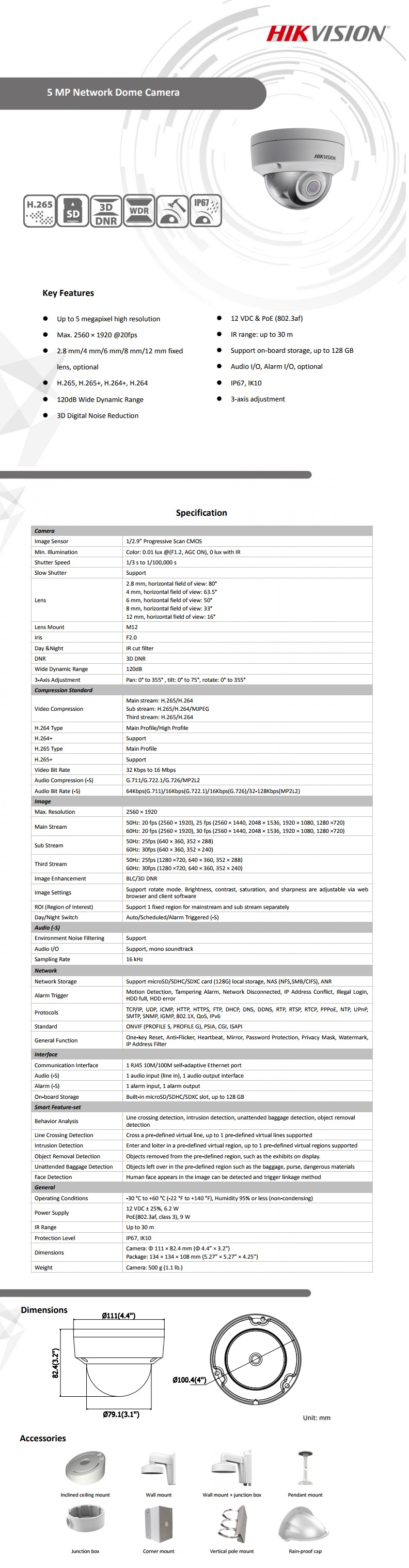5 Megapixel 4K UltraHD H.265+/ H.265/ H.264 IR