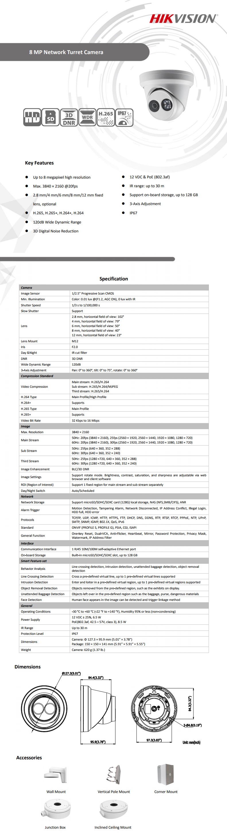 Dome IP 8MP Ultra-Low Light EXIR 20m Lentila 2.8mm Hikvision new