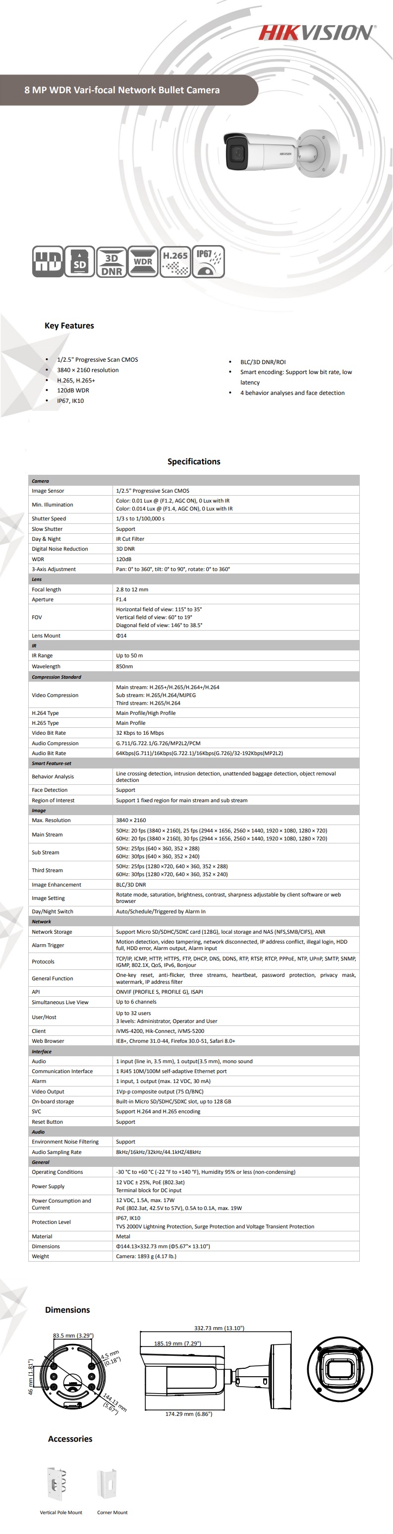- Model: Bullet IP Exterior 4K 8Mpx 2.8-12mm IR 50m Hikvision