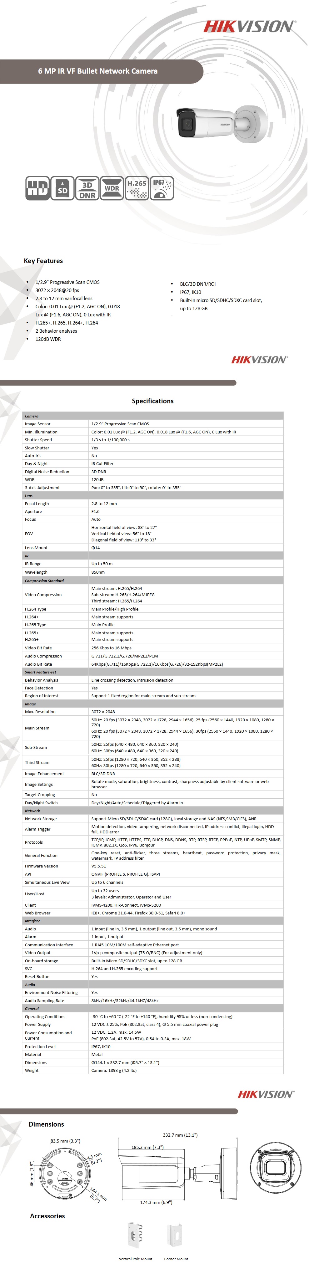 - Model: Bullet IP 4K UltraHD 6MP WDR IR 50m 2.8-12mm/4x IK10 Hikvision