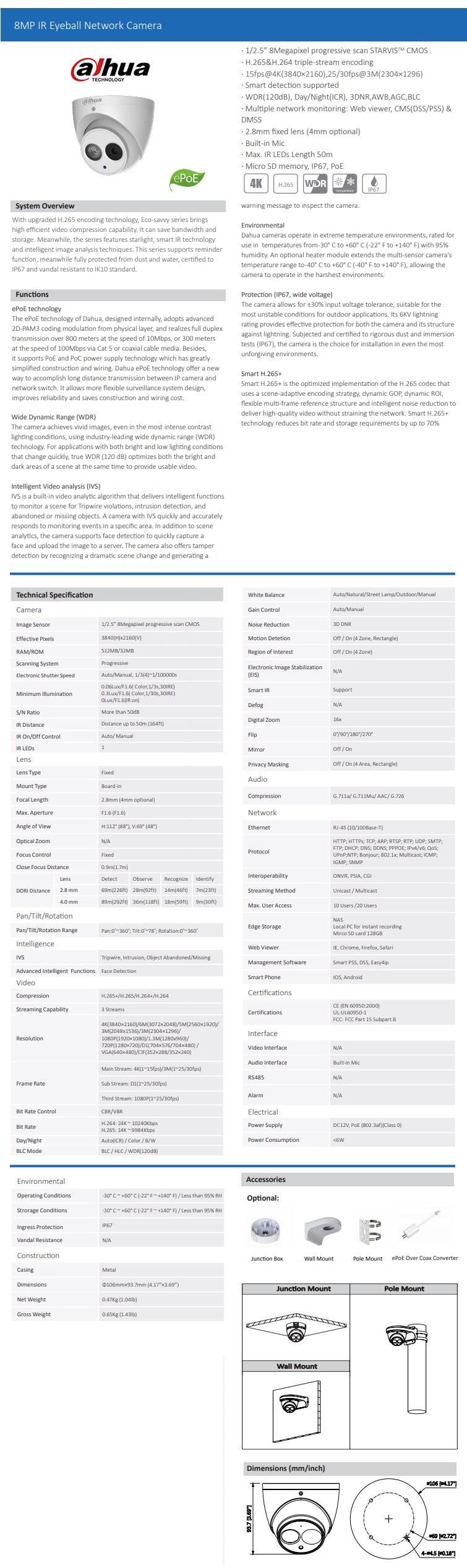 - Model: IP Exterior 4k 8Mpx IR 40m 2.8mm H.265 PoE Day&Night Dahua
