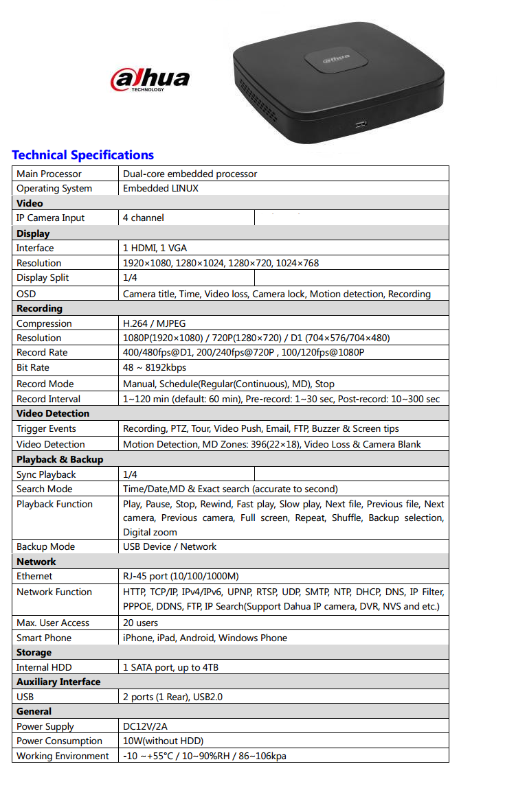- Model: Nvr-4Canale-Video-2Megapixeli-4Poe-Dahua