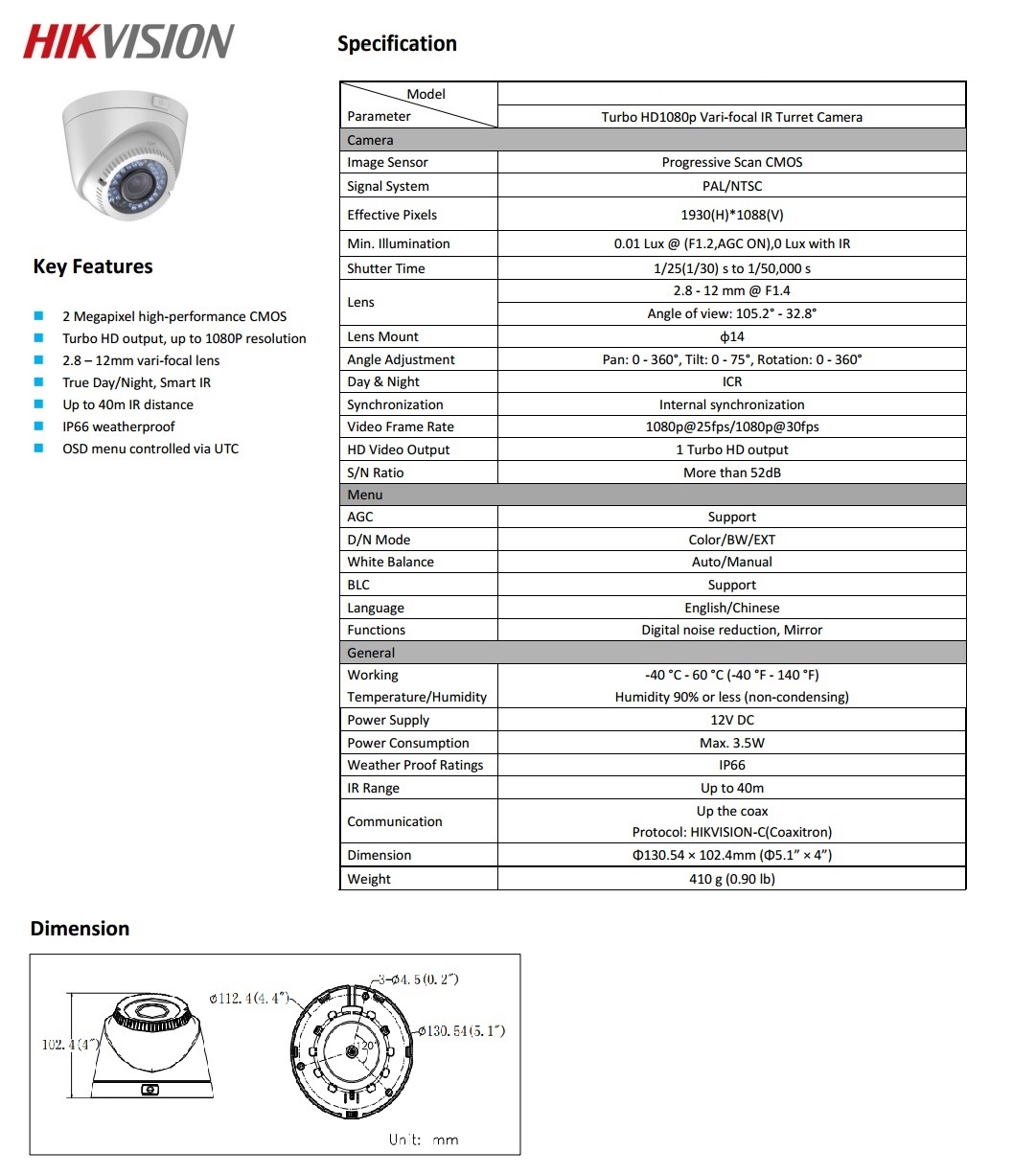 - Model: Dome Turbo HD 1080p Ir 40m Lentila Varifocala 2.8-12mm Hikvision