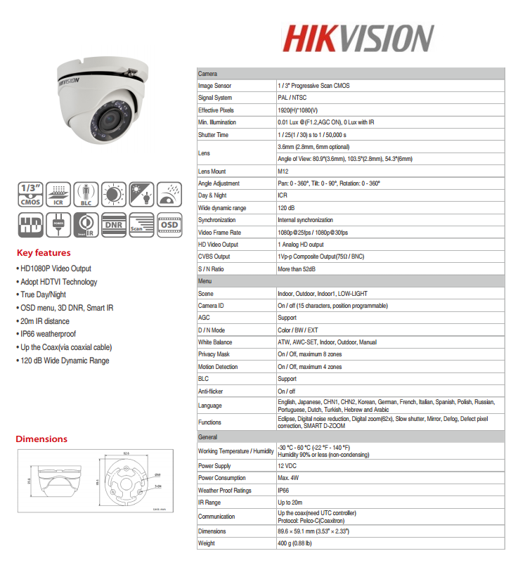- Model: Dome Exterior Turbo HD IR 20m 1080p Lentila 2.8mm Hikvision
