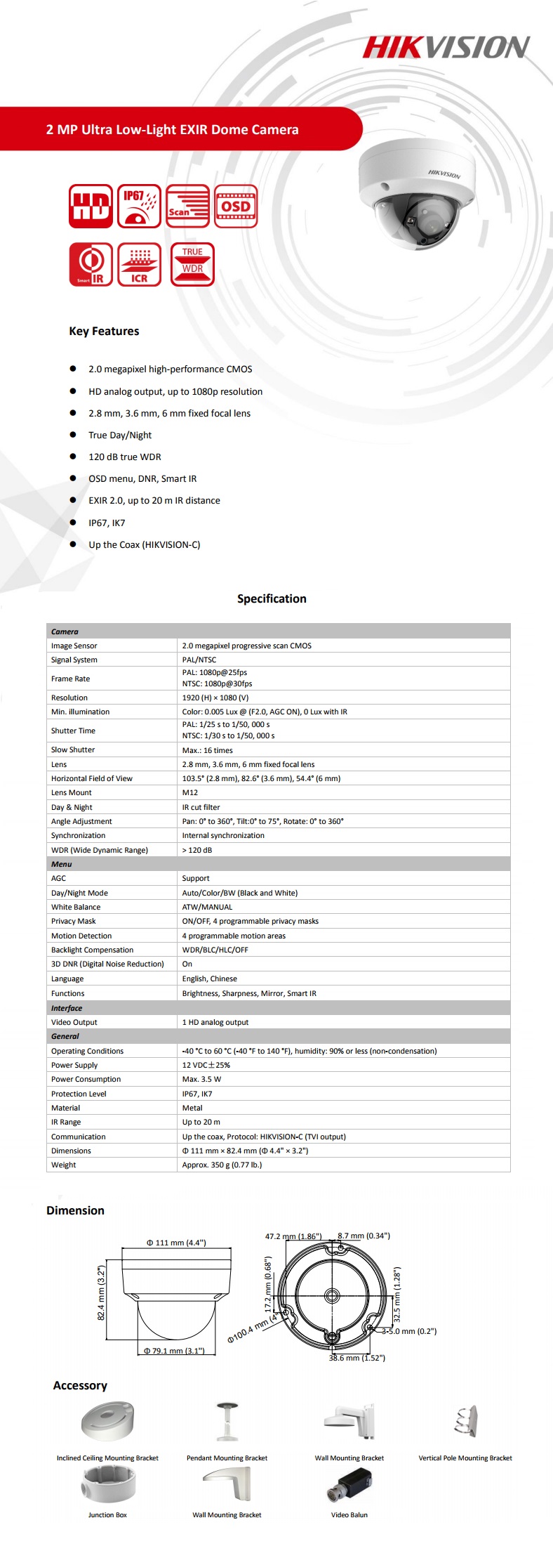 - Model: TurboHD Ultra Low-Light 2Mp Lentila 2.8mm IR 20m WDR Hikvision s