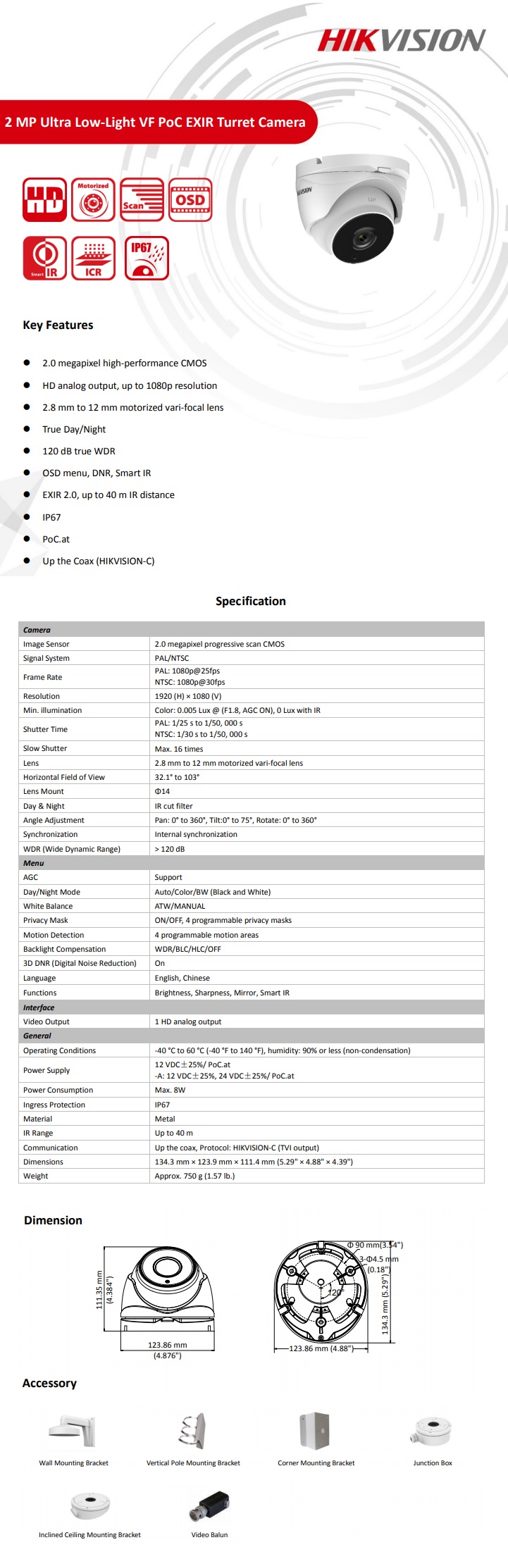 - Model: Dome TurboHD Low-Light 2Mpx Varifocal 2.8-12mm IR 40m Hikvision