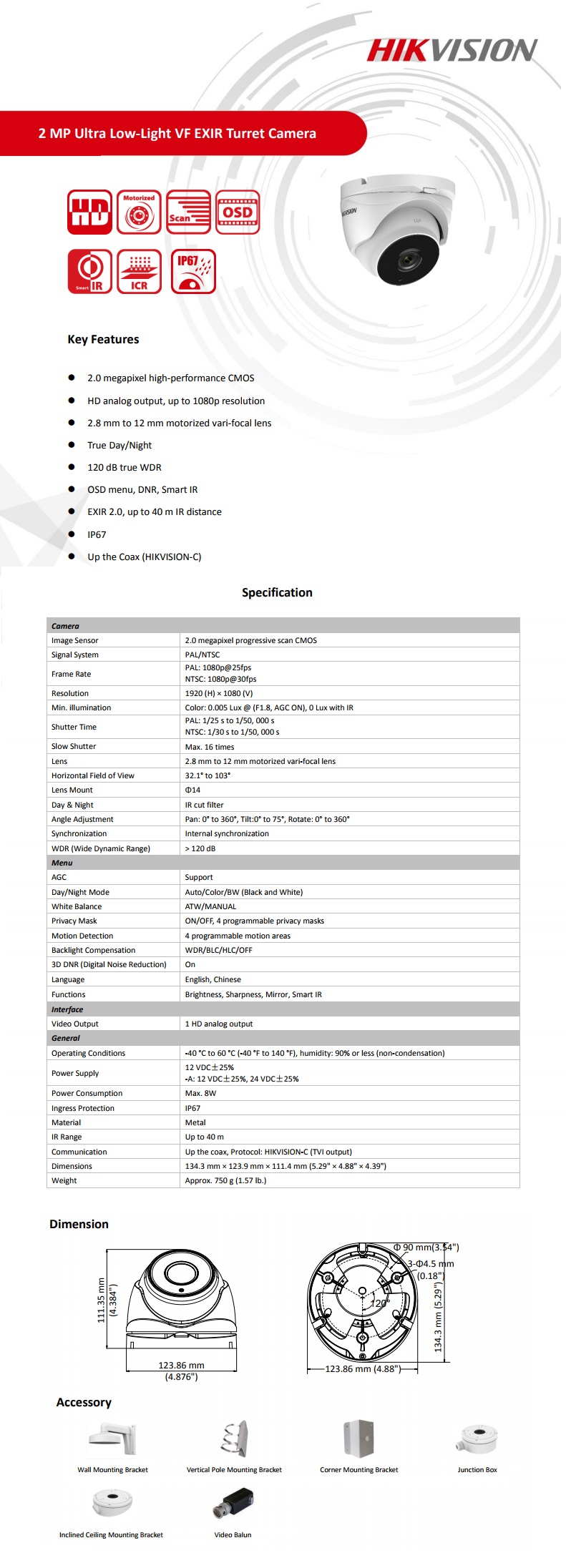 - Model: TurboHD Ultra Low-Light 2Mp 2.8-12mm IR 40m WDR Hikvision sh